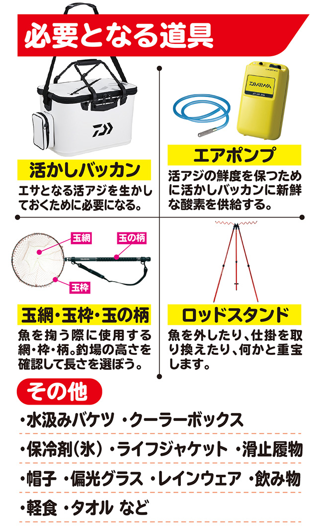 水汲みバケツ ・クーラーボックス・保冷剤(氷) ・ライフジャケット ・滑止履物 ・帽子 ・偏光グラス ・レインウェア ・飲み物 ・軽食 ・タオル など